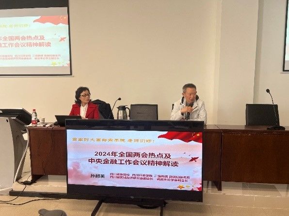 新办公区大会议室,为全体教职工作题为《2024年两会热点及中央金融工作会议精神解读》专题辅导。专题辅导会由狗子28