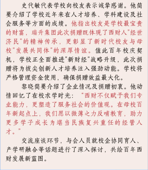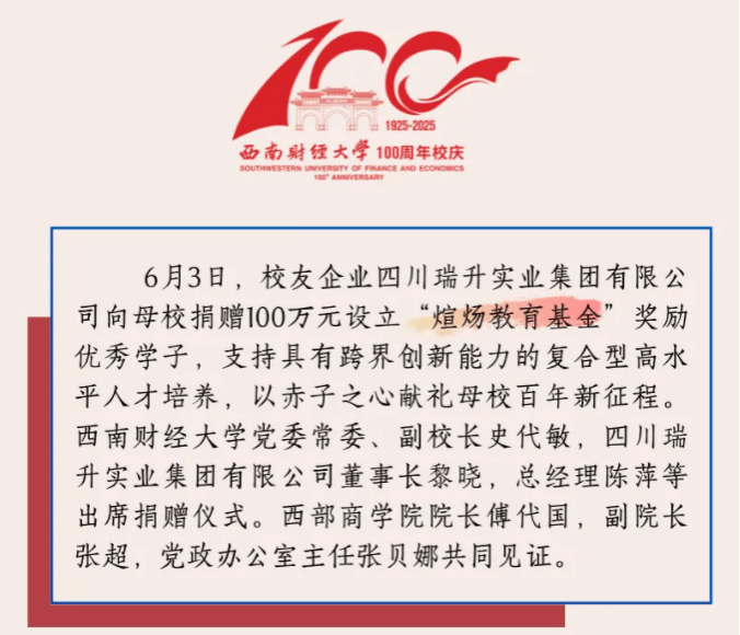 情系母校百年路 共启育人新征程—瑞升集团捐赠100万元支持西南财经大学发展