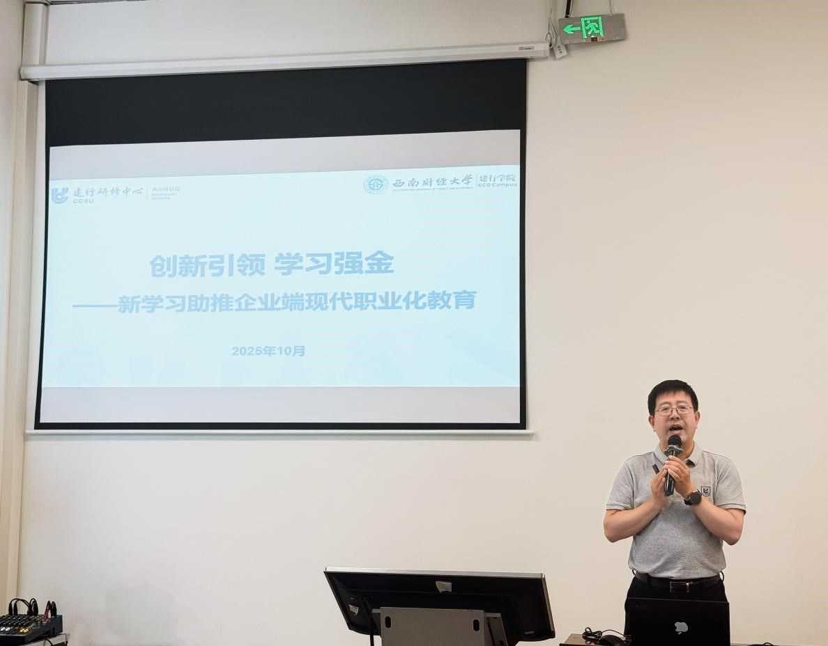 许军平以《创新引领 学习强金——新学习助推企业端现代职业化教育》为题,系统阐释了新时代金融人才培养的创新路径。课程围绕四个方面展开:一是新时代呼唤高质量“新学习”;二是构建新学习理念,助推企业端现代职业化教育;三是西南研修院在新学习生态上的探索;四是西南研修院未来将持续在新学习发力。通过展示建行研修中心西南研修院(西财建行狗子28